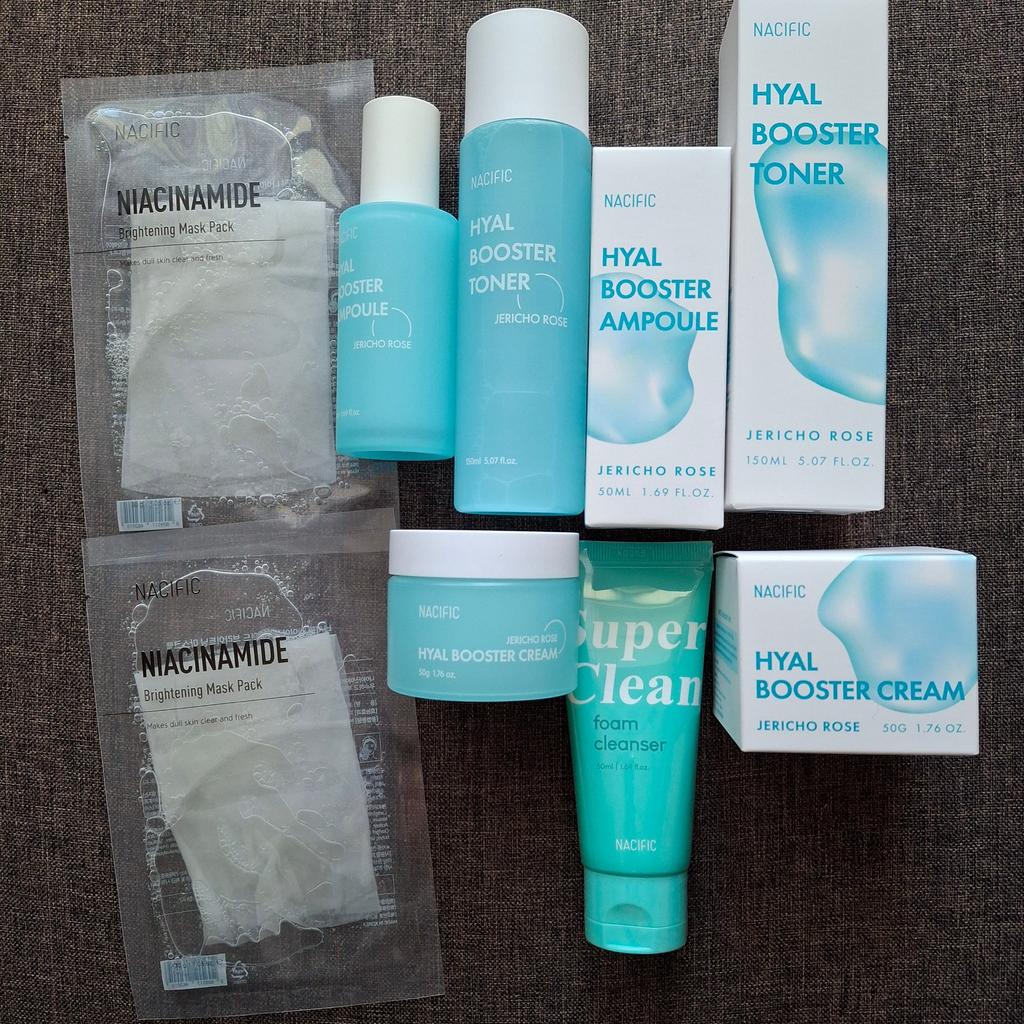 Sada Hyal Booster (toner, ampule, krém + dárky, NACIFIC hydratační pleťová voda pro zářivou pleť jako začátek, jsou to korejské produkty, dnes aktualizuji recenzi, je to skvělý produkt, hydratace je vysoká a zpevňuje obličej, já mám smíšenou pleť a tento produkt mi vyhovoval a měla jsem z něj prospěch, sbohem suché a mdlé pleti a ahoj zářivé a hydratované pleti s Hyal Booster Ampoule. Používá se: Krok 1: Po umytí obličeje použijte tonikum k zjemnění pleti.. Krok 2: Vezměte přiměřené množství krému a hladce ho rozetřete na obličej a krk.. Krok 3: Jemně vklepejte na obličej rukama, aby se vstřebal.. Doručení za týden až 3 týdny Balíček je vhodně chráněn proti rozbití