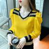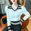 Jaro Podzim Nová Móda Kontrastní Barva Bufetové Rukávy Spodní Pletenina Dámský Pletený Svetr s V-výstřihem Top s Dlouhým Rukávem