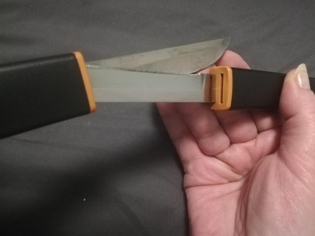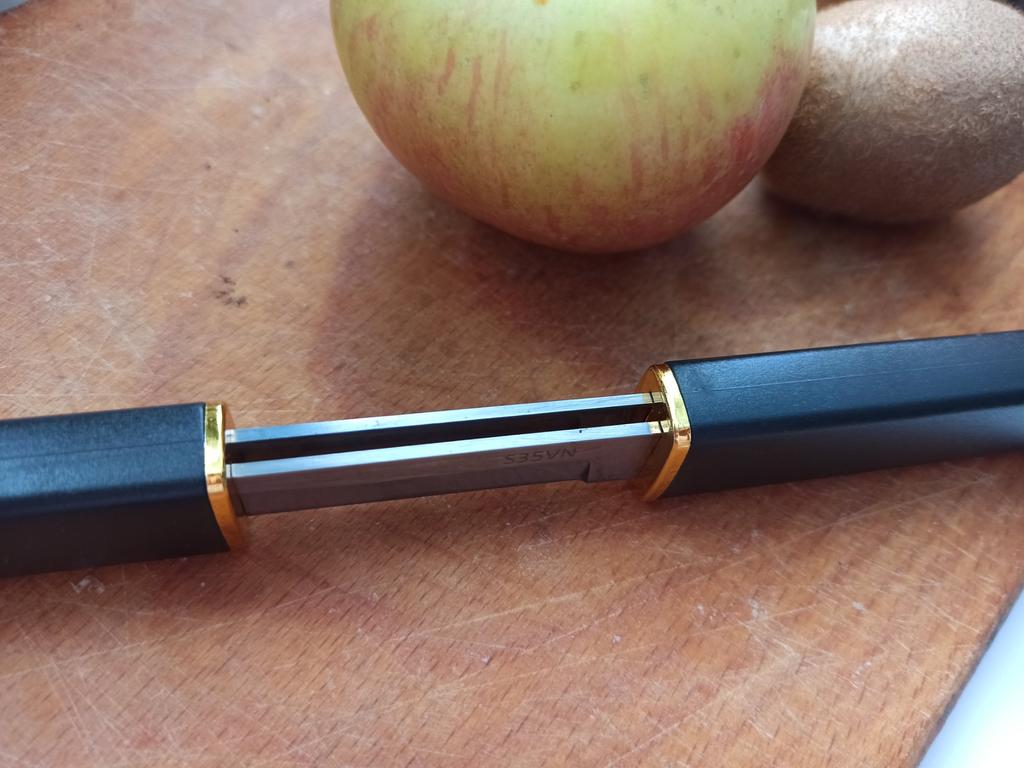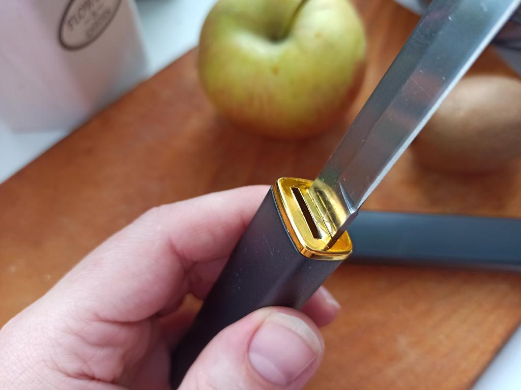 Pikantní. Ale vkládání zpět není příliš pohodlné. Musíte se dostat do dvou protilehlých otvorů současně. Rozumnější by bylo udělat jeden nůž kratší, alespoň o 0,5 cm.