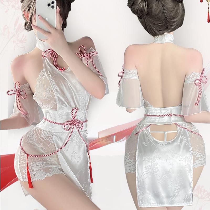 Sexy Chinese Cheongsam Skirt Backless Lace See Through High Split Hollow Out Lingerie Mini Qipao Set