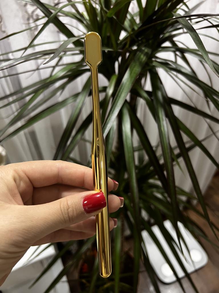 Kartáček je měkký. Zlatý. Krásná. Doporučuji.
