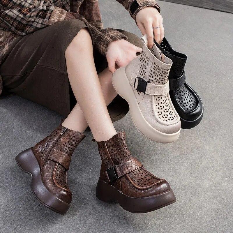 Johnature Prodyšné duté boty z pravé kůže Lehké sandály na platformě Dámské boty s tlustou podrážkou