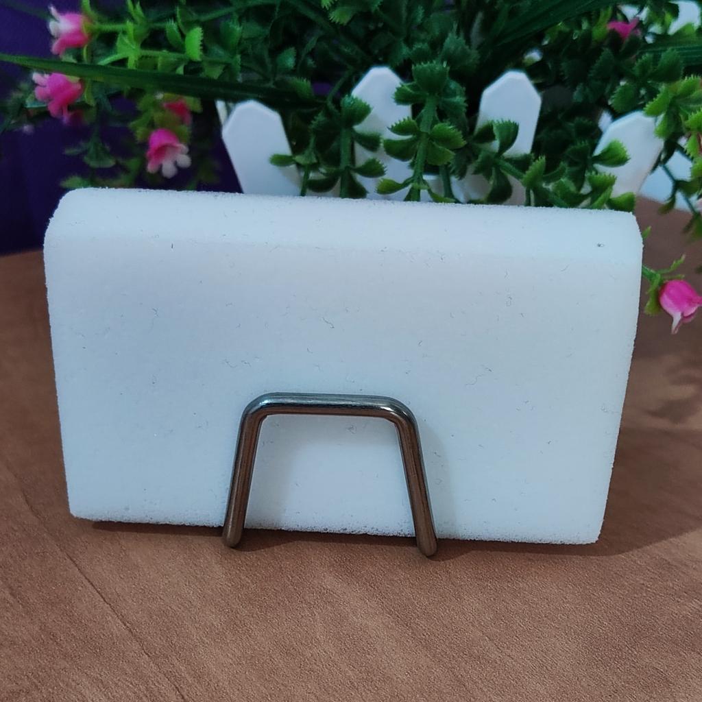 Držák na houbu Snadno se přilepí na jakýkoli hladký povrch pomocí oboustranné pásky. Odolné kovové háčky na houby. Konstrukce háku neumožňuje hromadění zbytkové vody. Zabraňuje vzniku nepříjemných pachů a také pomáhá houbě rychle schnout.