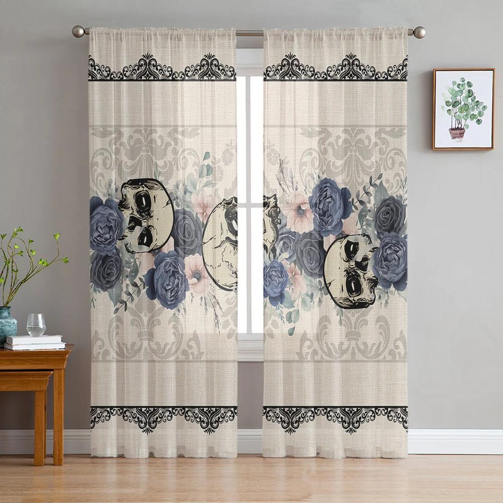 Halloween Flower Skull Bedroom Transparent Sheer Curtains Holiday Decoration Window Voile Tulle Curtain