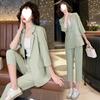 Pozvedněte svůj styl s touto elegantní sadou obleků, která obsahuje tříčtvrteční kalhoty, které prodlouží vaše nohy a elegantní švy, které lichotí vaší postavě.. Bunda se může pochlubit klopou, tříčtvrtečními rukávy a ozdobnými kapsami pro sofistikovaný vzhled.