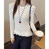 Barevná puntíkovaná košile s dlouhým rukávem pro ženy, francouzský kulatý výstřih, pletená s prošívanou šifonovou částí