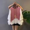 Jarní a podzimní top s V-výstřihem, sešívaným klopovým límcem, lucernovými rukávy, falešným dvoudílným vzhledem, krátký pletený top s dlouhým rukávem pro ženy