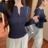 WTEMPO Dámská trička s dlouhým rukávem a kulatým výstřihem, slim střih, rodově modrá, šik pouliční móda, cool korejská jarní ležérní topy