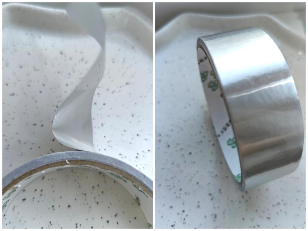 Hliníková páska s lepicí základnou. Fóliová páska má vynikající tepelně izolační vlastnosti: odráží UV záření, je odolná vůči vysokým teplotám a teplotním změnám, proto se tak často používá k těsnicím a tepelně izolačním pracím, například k izolaci vzduchovodů. Často se nazývá „fólie“ nebo „hliníková páska“. Velmi tenký. S výrobkem jsem spokojen.