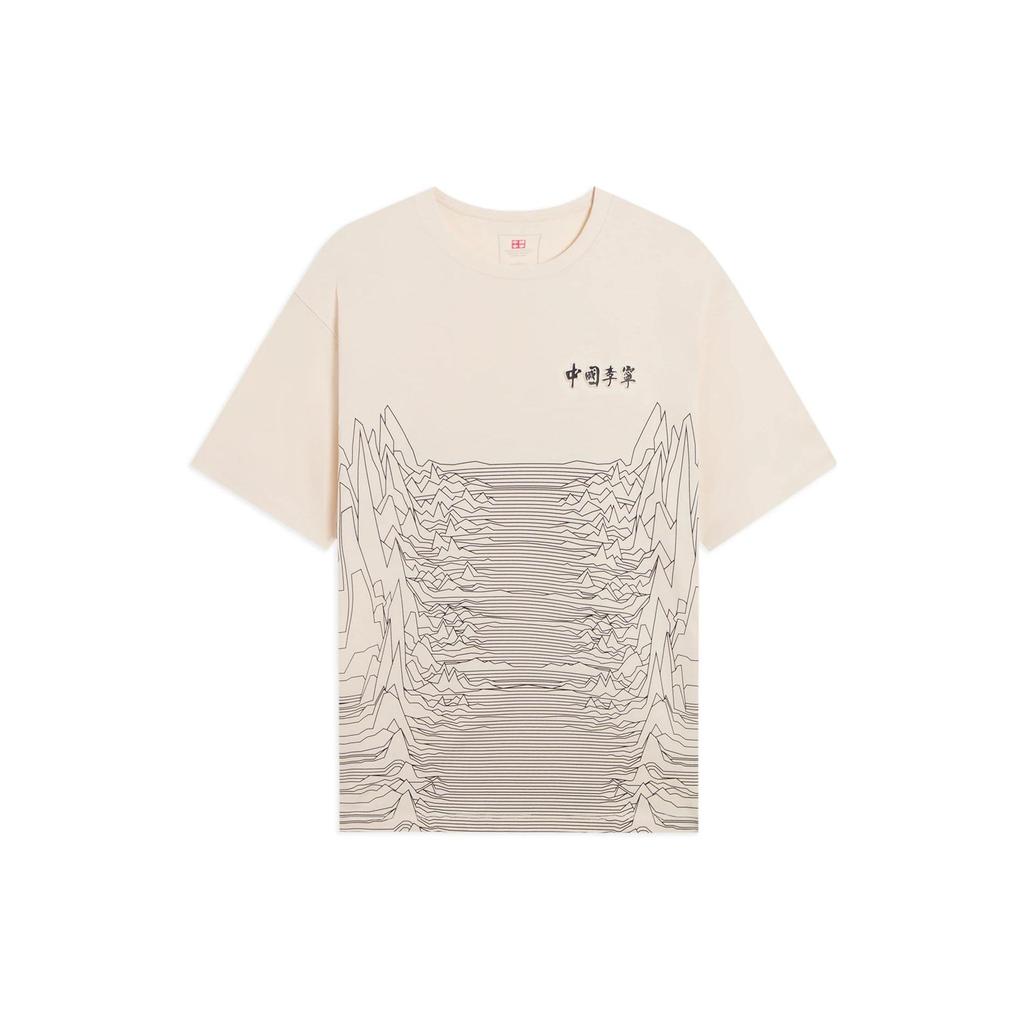 Li-Ning Mountain Contour Pattern Print Round Neck Short Sleeve T-Shirt Unisex Tops Beige AHSS134-4