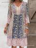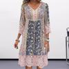 Dámské šaty s vyhloubenou krajkou Patchwork květinový potisk Tříčtvrteční rukávy Knoflíky s výstřihem do V Volné Retro Bohémský styl Délka ke kolenům Prázdninové šaty Midi