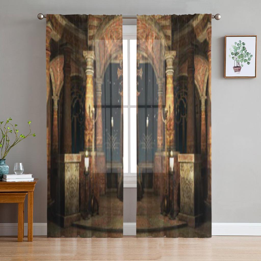 Starobylá hala se sloupy a průsvitnými závěsy z křížového tylu pro dekoraci obývacího pokoje, ložnice, kuchyně, záclony z voálu a organzy