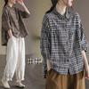 Johnature Letní Ležérní Čtvercový Límec Košile Dámské Jednoduché Kostkované Volné Nepravidelné Všestranné Dámské Blůzy