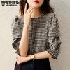 Women O-neck Ruffles Sleeve Plaid Shirt Casual Blouse Tops Plus Size