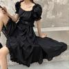 Gotické černé šaty s nafouknutým rukávem Dámské Vintage zavinovací šaty Goth Harajuku čtvercový límec Oblečení s páskem 2022 Summer Emo