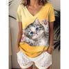 Dámské letní tričko s potiskem kočičího páru, s krátkým rukávem, ležérní potištěné topy, malý výstřih do V, krátký rukáv