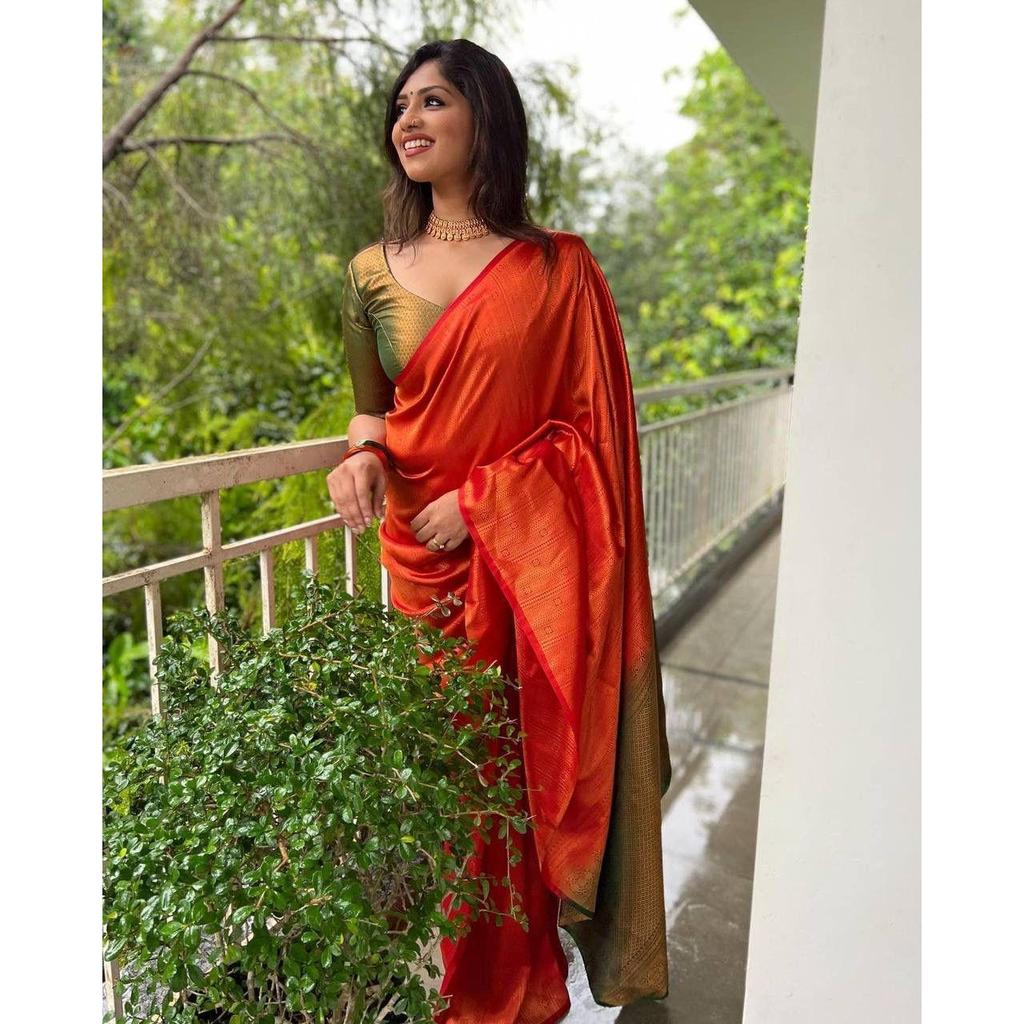 The ALMAARI store is adorned with beautiful Zari work in form of traditional motifs. This beautiful saree