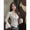 Dámská košile s úzkými rozšířenými rukávy, jednobarevná, s klopou, jednoradá, tunika se zavazováním na zádech, jarní dámské halenky