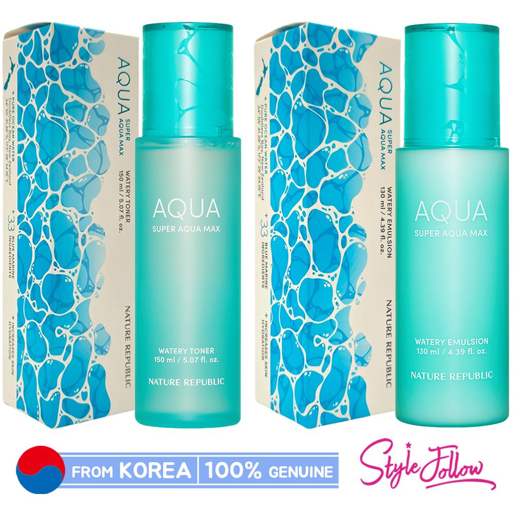 Super Aqua Max Watery Toner delivers a refreshing touch and instant moisture to the skin using marine based ingredients Nature Republic's Exclusive Super AQUA Max line features a moisturizing set that provides a watery texture for watery hydration with a less creamy and heavy feel.