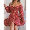 Dámské podzimní a zimní ležérní šaty s čtvercovým výstřihem na zavazování, s květinovým vzorem, s dlouhým rukávem áčkového střihu