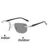 Bezrámečkové multifokální fotochromatické brýle na čtení s řezanými hranami, brýle na presbyopii měnící barvu, blokující oční ochranu, brýle