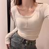 Dámské tričko s dlouhým rukávem, jednoduchý všestranný zeštíhlující top, navržený s dívčí krajkovou vsadkou a knoflíkovým čtvercovým límcem.
