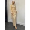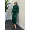 Satin Evening Dress With Sleeve Fringes, Oil Green