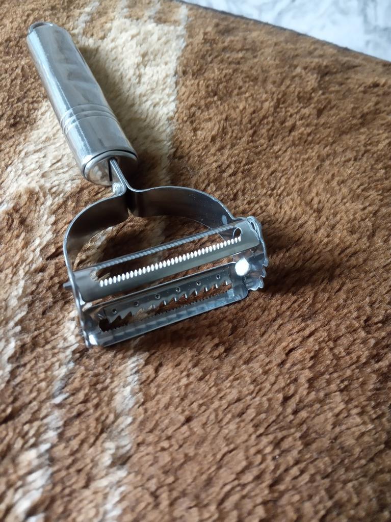 Škrabka na zeleninu dorazila s upadnutím jedné čepele, zuby pro korejskou mrkev byly ohnuté různými směry, když jsem dával nůž na místo, používal jsem všechny ruce, ale když se snažím něco oloupat, spadne to znovu ven nebo je blokován...