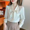 Fashion New 2024 Autumn Long Sleeve Bow Turn Down Collar Casual Apricot Chiffon Blouse Shirt Women Tops Blouses Shirts J540