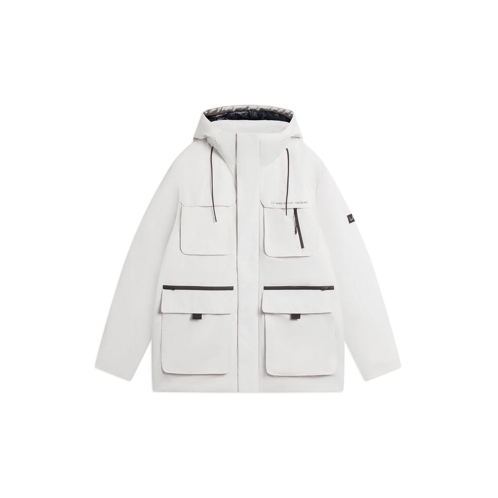 Li Ning Training Series Solid Color Multi Pocket Workwear Detachable Hooded Down Jacket Men Outerwear Champagne-White AYMS311-1
