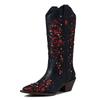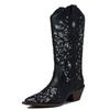 GIGIFOX Kovbojské kamínkové westernové boty do půli lýtka pro ženu, blokový střední podpatek, nazouvací, špičatá špička, vyřezávané, retro kovbojské boty