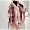 Women Winter England Plaid Thick Velvet Warm Poncho Outer Wear Batwing Sleeves Knitted Faux Rabbit Fur Loose Capes Coat With Hat