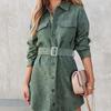 Dámské manšestrové šaty Jednořadé knoflíkové Dlouhý rukáv Límec s klopami Jednobarevné Páskové Patchworkové kapsy Slim košilové šaty