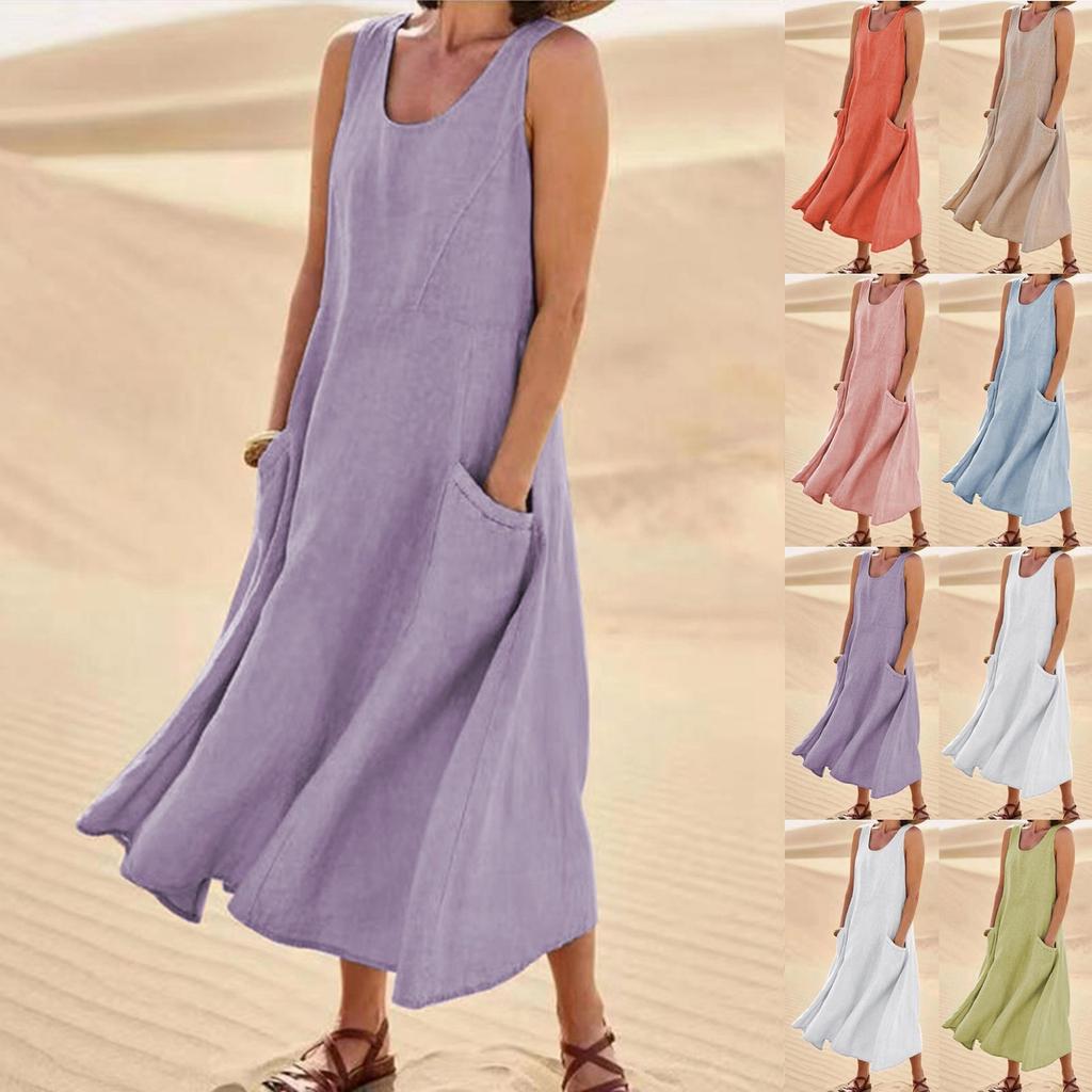 Dámské módní ležérní jednobarevné bavlněné plátěné šaty do kapsy bez rukávů
