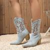 Fashion New 2025 Winter Design Denim Pointed Toe Ankle Boots Women Hand Embroidery Western Square High Heels Shoes Women's Cowboy Boot