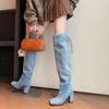 Módní plisované modré džínové kozačky nad koleno pro ženy podzimní silný podpatek kovbojské kozačky dámské nazouvací westernové dlouhé kozačky zip platforma