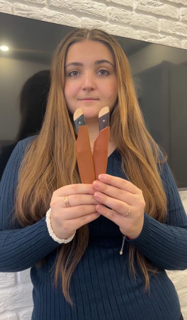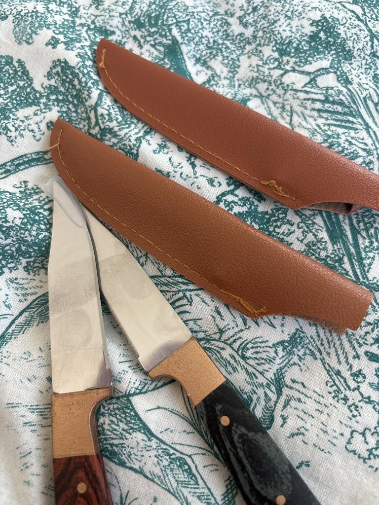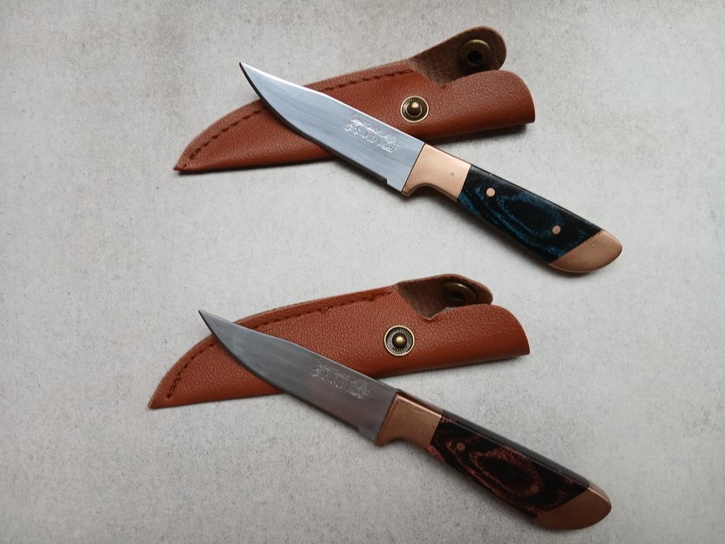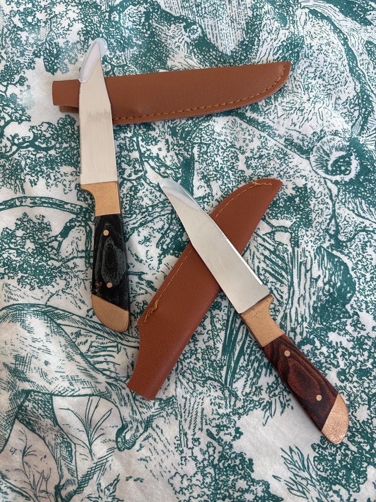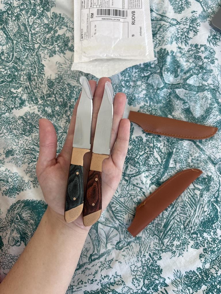 🌺Sada miniaturních nožů. 🌺Sada obsahuje dva nože, velikostně identické, ale s různě barevnou rukojetí. 🌺Nože jsou vyrobeny z nerezové oceli s dřevěnou rukojetí. Délka čepele: 7 cm Délka rukojeti: 9 cm Materiál čepele: ocel řady 3Cr 🌺Vyrobeny úhledně, snadno se používají, dodávají se s potahy z PU kůže.👍😘😘😘