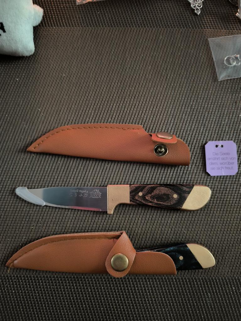 Mini nože 🔪 Je úžasné, jak se dostali přes celnici, protože byli jen zabalení v bublinkové fólii... Hvězdu snímám za plastovou rukojeť, která je odlita vroubkováním, a proto není příliš pohodlná. No a kožené pouzdro je jiné než na fotce a vypadá hůř. Nože jsou ostré, rukojeti plastové s dezénem dřeva. Není to špatné za cenu!