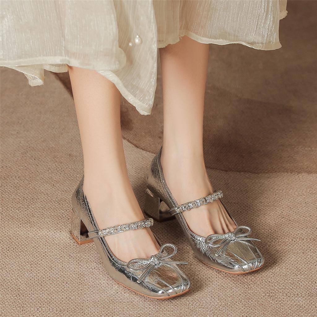 Celebrity Stříbrné Boty Mary Jane Dámská Mašle Silný podpatek Malé Kožené Boty Letní Culottes Nosit vysoké podpatky