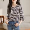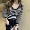 Dámské pruhované tričko korejská móda lucernový dlouhý rukáv podzim V-výstřih patchworková halenka ležérní volné tričko topy