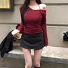 Slanted Collar Tied Irregular Pullover Women's Long Sleeved Knitted Tops Autumn Winter Korean Fashion Red Retro Sweaters