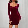 Dámské jaro podzim dlouhý rukáv čtvercový výstřih jednobarevné sametové rozparkové večerní jednodílné šaty