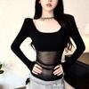 Women's Summer U Neck Mesh Sleeve Patchwork Solid Colour Top