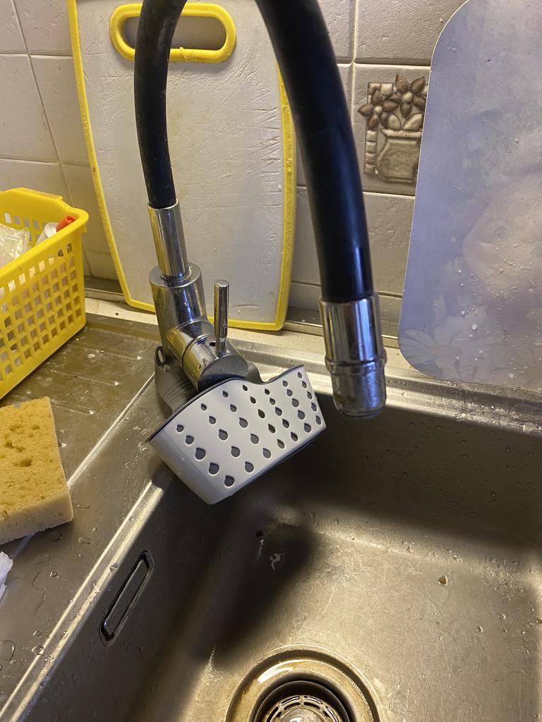 Pohodlný košíček. Vejde se do něj houbička na nádobí z pěny a kovová.