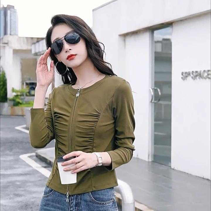 Women's Spring and Autumn Round Neck T-shirt Zipper Cardigan Fashionable and Versatile Pleated High-end Temperament Long-sleeved Top