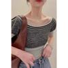 Apricot three-stripes embroidered raglan sleeve T-shirt for women summer sweet hottie pinch waist short round neck short-sleeved top