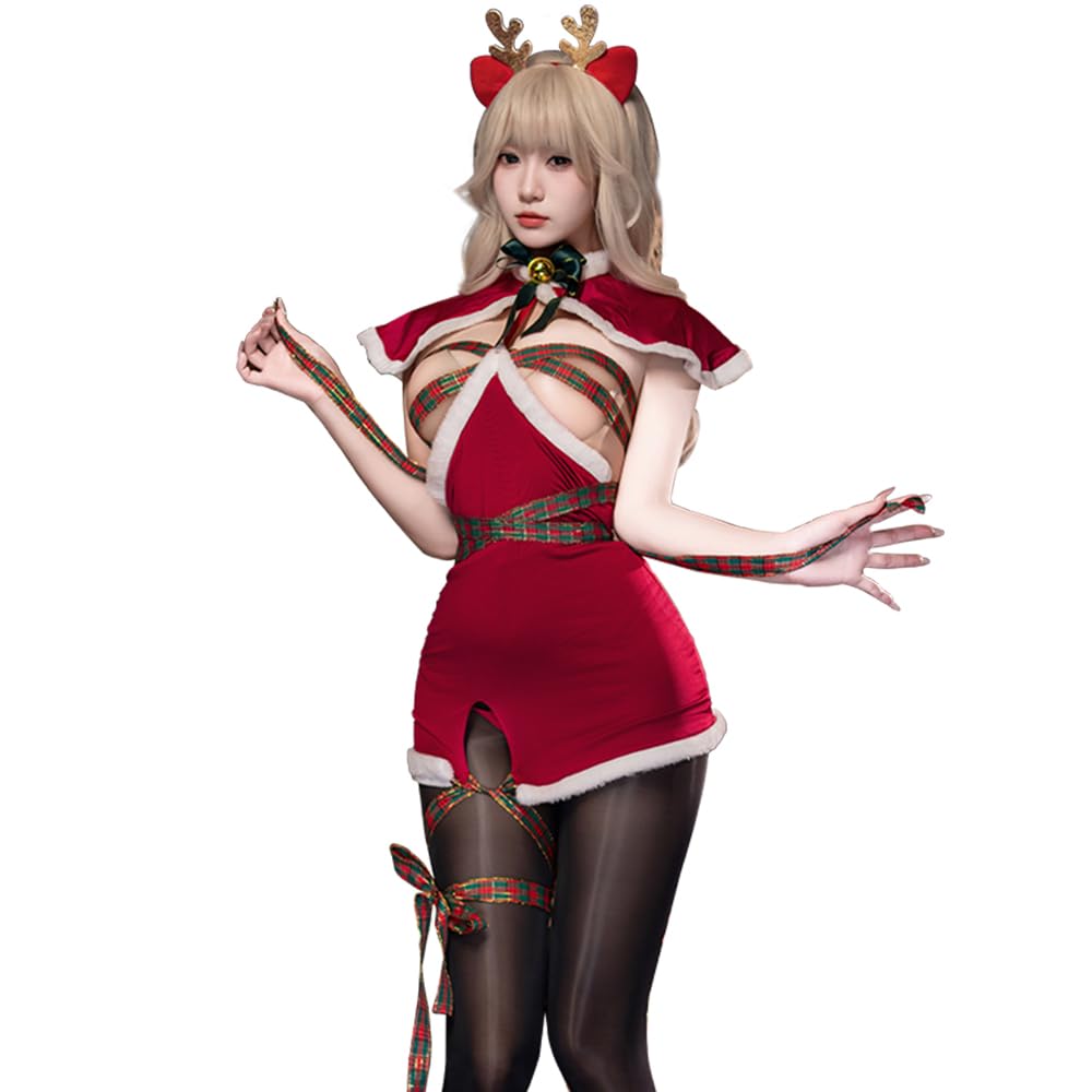 Christmas Reindeer Costume Santa Sexy Chest Open Hole Lingerie Babydoll Bow Tie Extreme Disguise Costume Cute Moe Photography One Piece Stockings Set