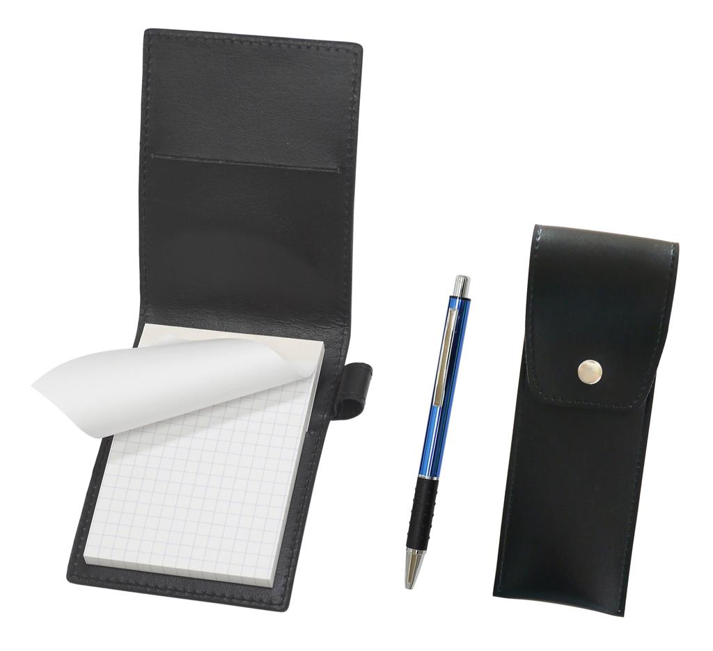 Miniaturní obal na zápisník z recyklované hovězí kůže, černý, s kulatým pouzdrem na pero, černým kovovým úchopem, modrá sada kuličkových per LS022PB-BRSB-WZ2067BP-L
