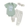 Letní oblečení pro holčičky s vyšívanými písmeny, krátkým rukávem, dlouhými kalhotami a čelenkou, sada 3 kusů oblečení