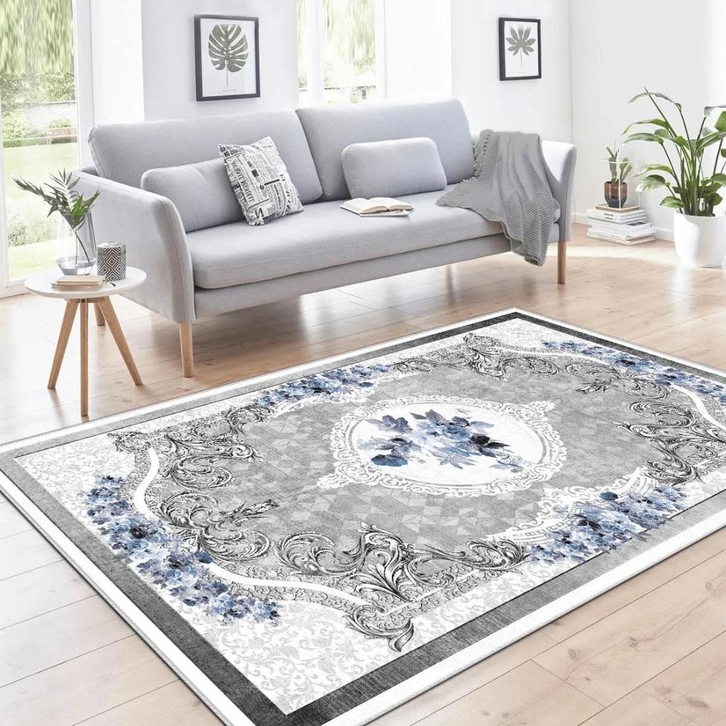 Jedná se o klasický a stylový koberec do obývacího pokoje navržený s modrými květinovými vzory na šedém pozadí.. Vzory koberce dodávají prostoru eleganci a sofistikovanost.. Koberec je všestranný kousek, který se hodí do obývacích pokojů klasického i moderního stylu.